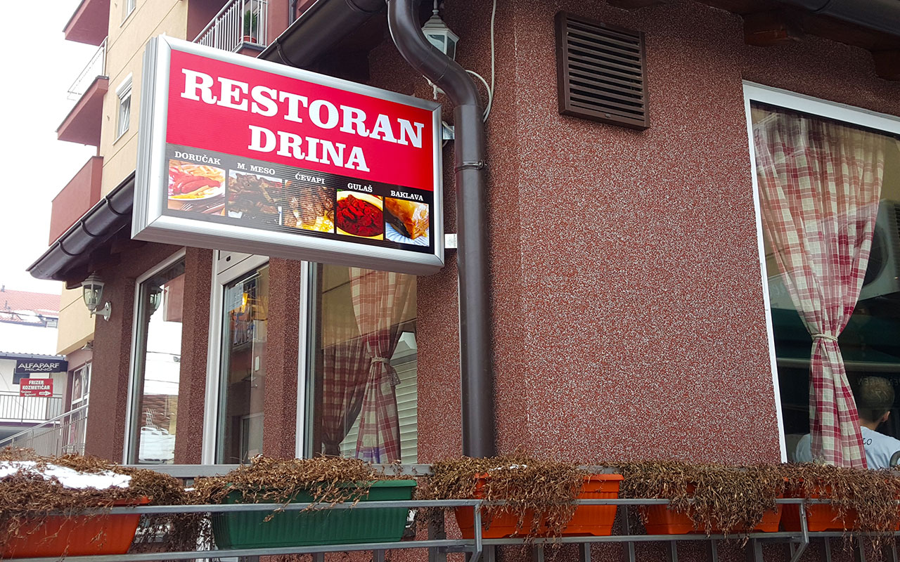 - dvostrane svetleće reklame. Postavljaju se levo ili desno od ulaza u lokal, normalno u odnosu na zid i služe za reklamiranje iz ugla potrošača koji se kreću trotoarom na strani na kojoj se nalazi sam lokal.